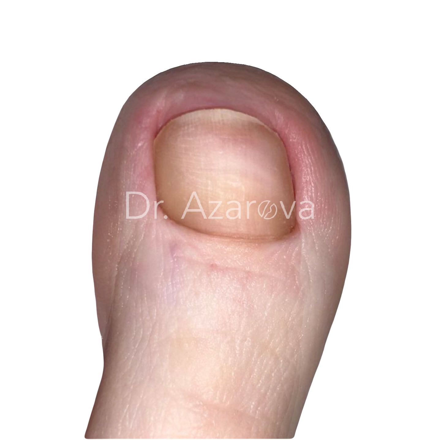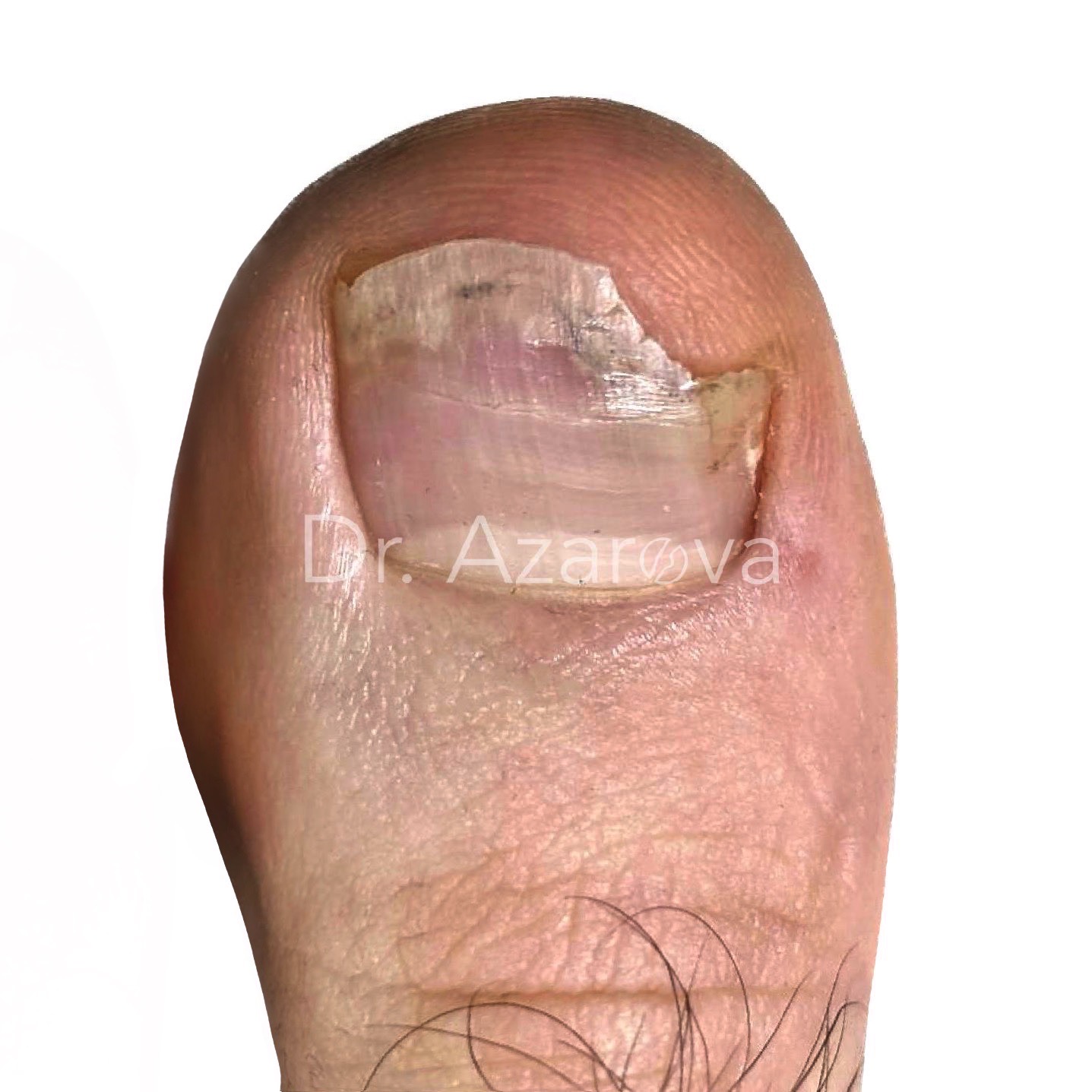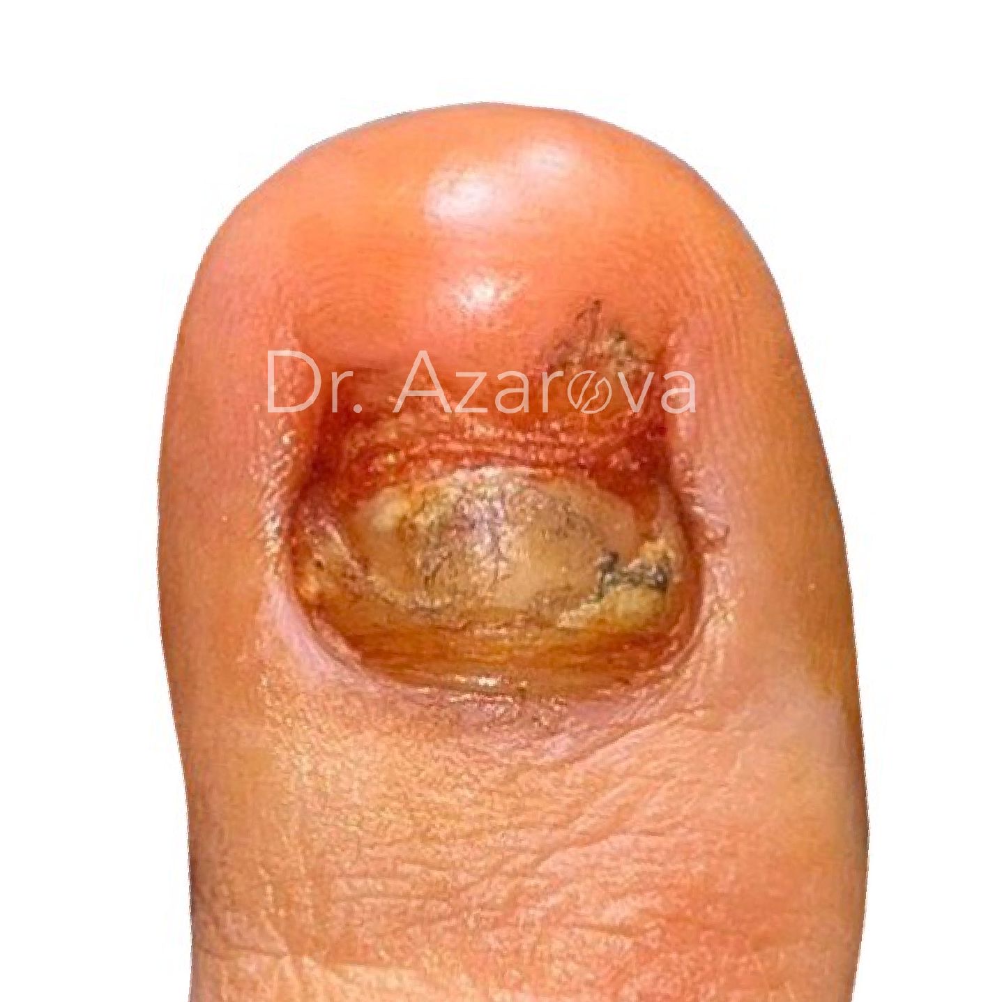 Около 10 лет назад после удаления вросшего ногтя у пациентки сформировалась гипертрофия околоногтевых валиков, в 2018г была проведена неудачная пластика, после чего возник фиброз и деформация околоногтевых тканей, нарушение роста ногтевой пластины. Консервативное подологическое лечение не привело к успеху.